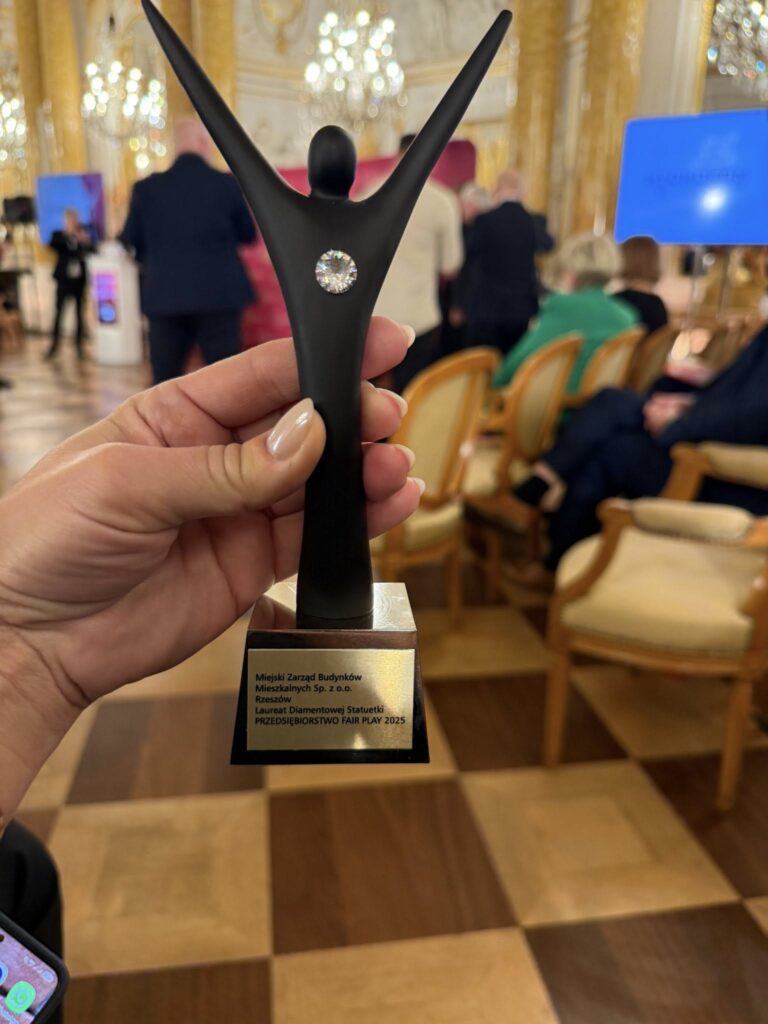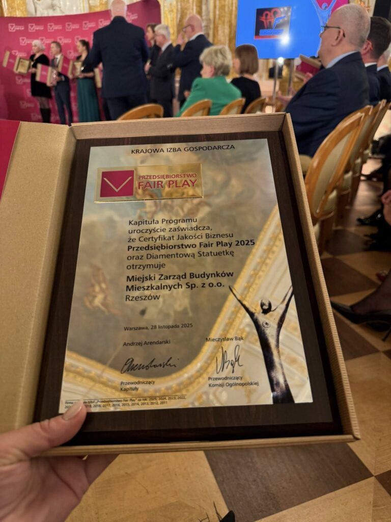 Wczoraj, w wyjątkowej scenerii Zamku Królewskiego w Warszawie, Miejski Zarząd Budynków Mieszkalnych Sp. z o.o. w Rzeszowie odebrała Diamentową Statuetkę oraz Certyfikat Jakości Biznesu Przedsiębiorstwo Fair Play 2025.